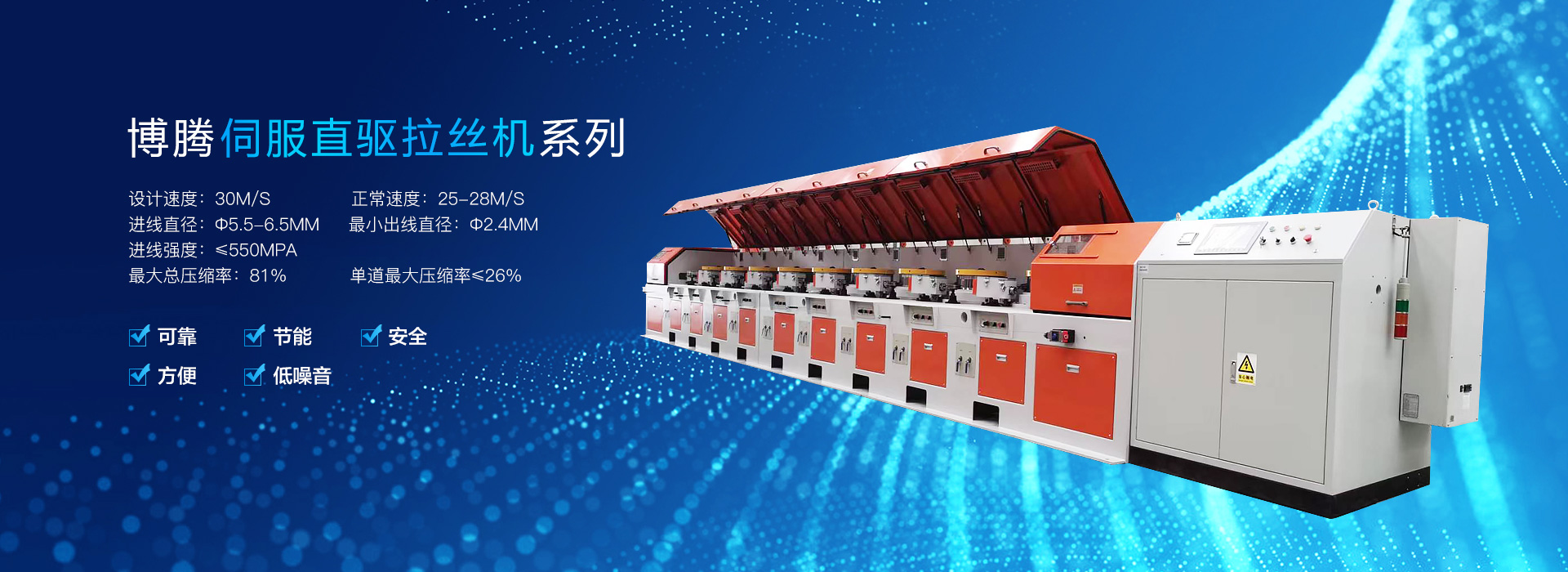 主要產(chǎn)品有直連式拉絲機(jī)+高速直線(xiàn)鍍銅焊絲生產(chǎn)線(xiàn)、CRZ-3000型全自動(dòng)焊絲層繞機(jī)、各種規(guī)格直進(jìn)式拉絲機(jī)(LSJ300~LSJ800),SDJ-300型砂帶拋光機(jī),各種規(guī)格的工字輪收、放線(xiàn)機(jī)、鋼帶復(fù)繞機(jī)等。直進(jìn)式拉絲機(jī)技術(shù)經(jīng)不斷改進(jìn)和完善,適用于多種領(lǐng)域,主要用于鍍鋅鐵絲、胎圈鋼絲、簾線(xiàn)鋼絲、鋁焊絲(含鋁鎂合金絲)、不銹鋼絲、藥芯焊絲、氣體保護(hù)焊絲等金屬線(xiàn)材。